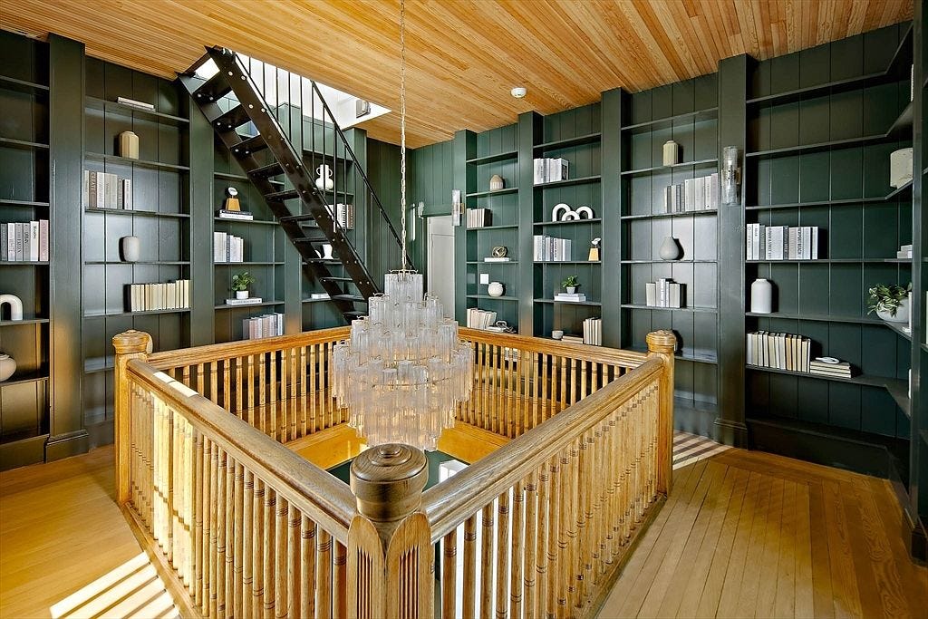 My favorite area from the limited photos we have of the home is the library/drawing room. The herringbone floors, detailed trim, bookcases on every wall, and an oversized carved fireplace give it a cozy dark academia feeling, while still having a nice amount of natural light so itās not too stuffy.