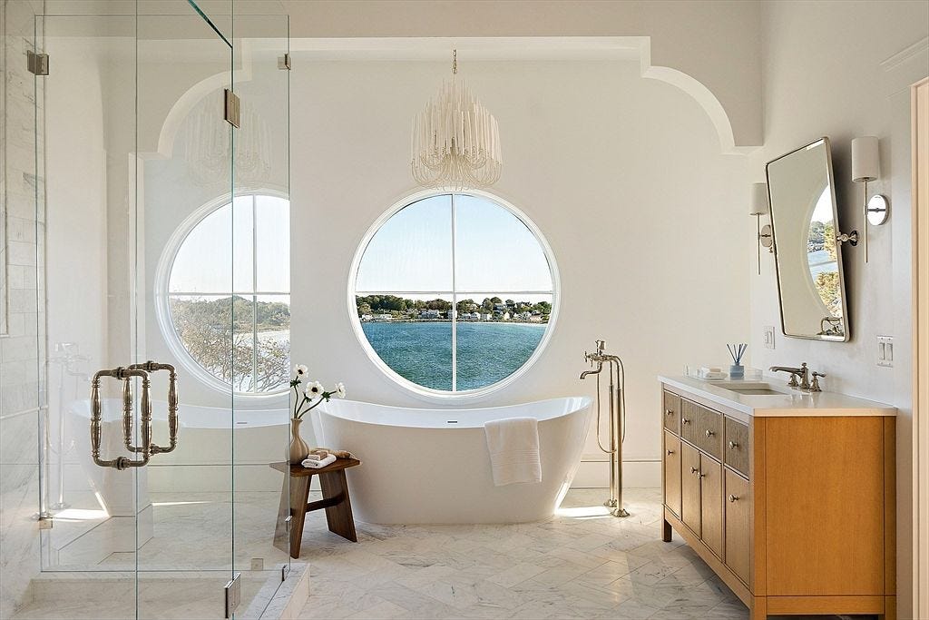 Having a bay window and a seating alcove, especially one with special curved detailing like this, makes the primary bedroom basically the bedroom of my childhood dreams, but the styling makes this entirely chic coastal grandmother. The best spot in the house is probably in this bathtub, from which you can admire a view of the bay through a porthole-like window.